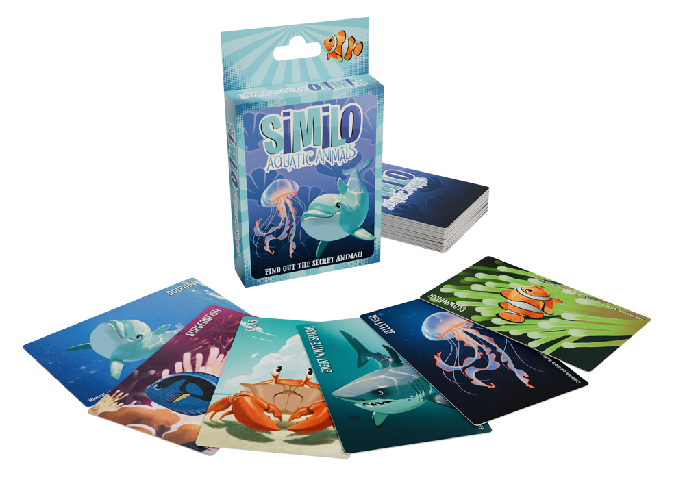 Similo: Aquatic Animals is a beautifully illustrated cooperative deduction card game where players work together to identify a secret aquatic animal from a lineup of cards. One player gives clues by playing other animal cards—without speaking—while the rest of the group interprets the similarities and differences to narrow down the mystery.