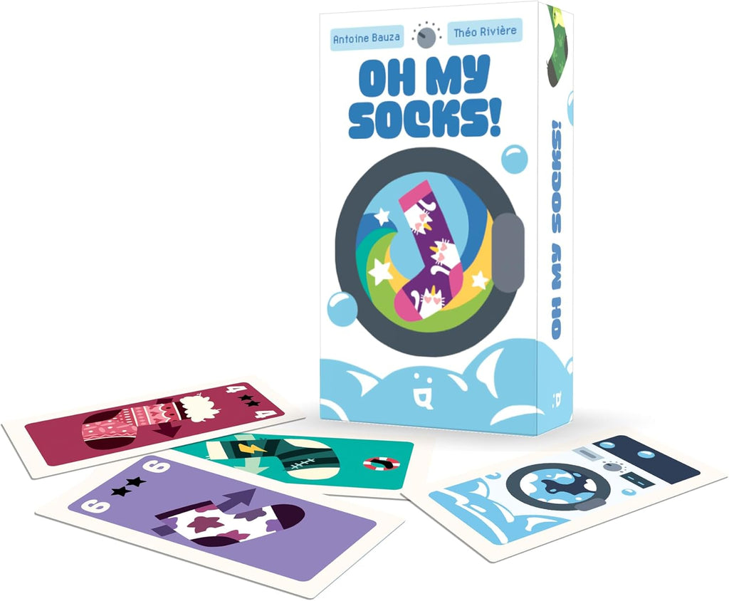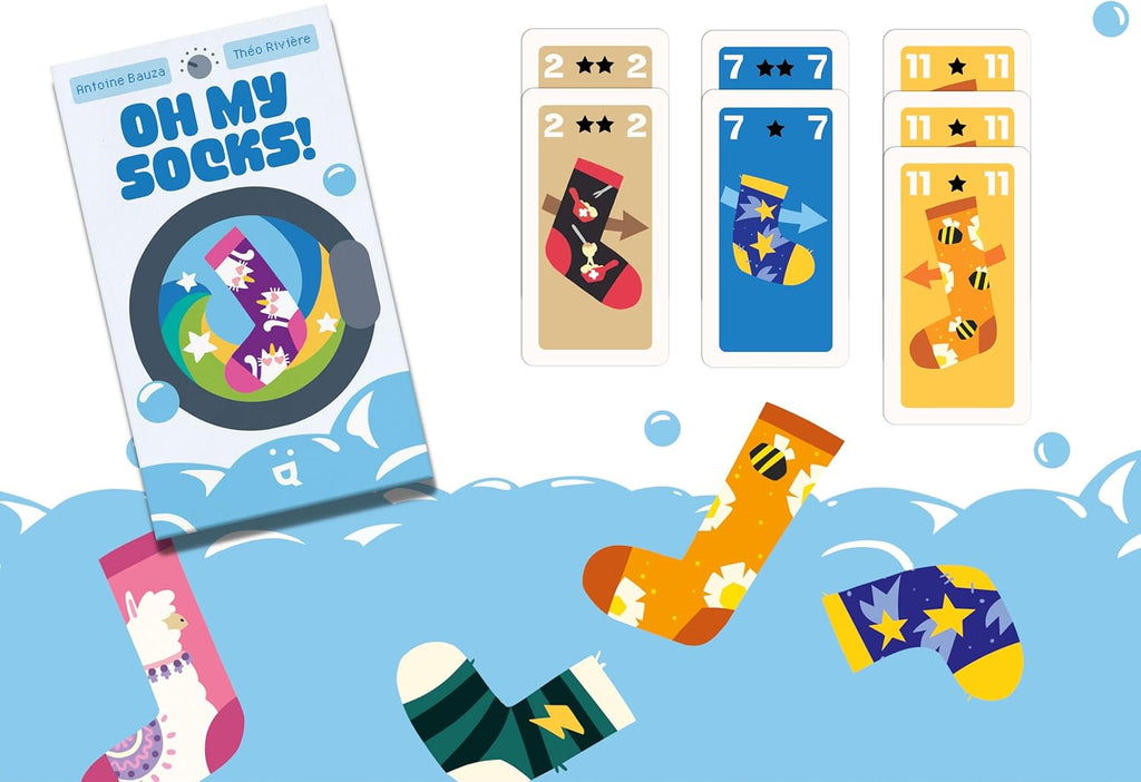 In Oh My Socks!, youβre racing to build the coolest sock collection before the washing machine starts. Draw two cards, keep one (and trigger its cheeky effect), then pass the other along. Match patterns to form pairs, but beware: end with an odd number in a pattern and youβll score nothing for it!
