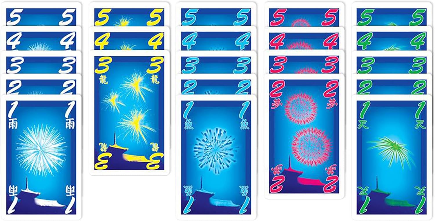 In Hanabi, players work together to create a dazzling fireworks display by playing cards in the correct order from 1 to 5 in each color. The twist? You hold your cards facing outward, so everyone else can see them—but you can’t. To succeed, your team must share limited clues, remember carefully, and make every play count.