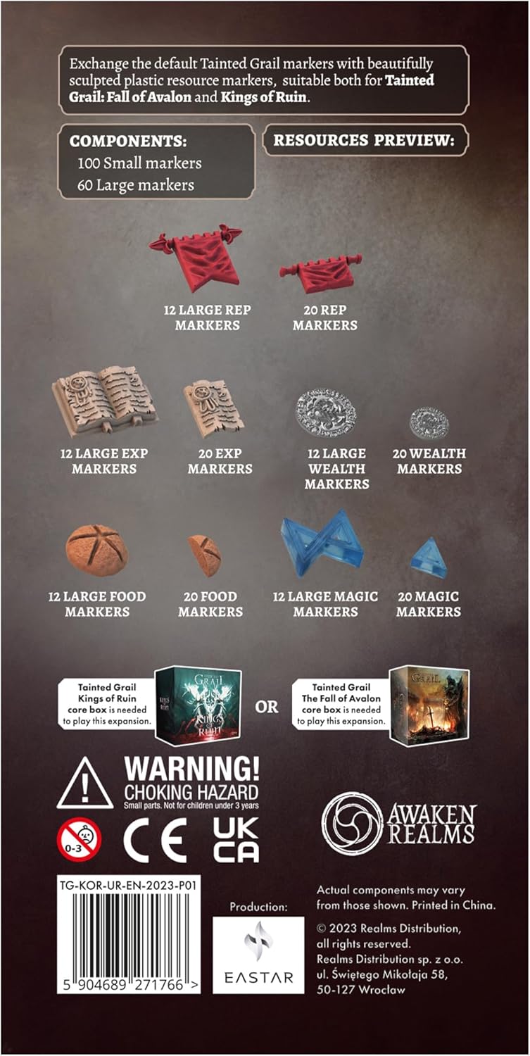 Enhance your Tainted Grail: Kings of Ruin experience with the Quality Resources accessory from Awaken Realms! This set of beautifully crafted resource tokens and components is designed to replace the standard game pieces, bringing a new level of immersion and tactile engagement to your adventures in Avalon. Whether you’re gathering supplies, trading with allies, or battling foes, these quality resources will elevate every aspect of your gameplay!