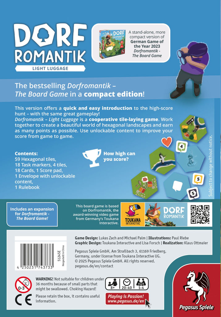 In Dorfromantik – Light Luggage, your team places hex tiles to weave villages, forests, tracks, and a river that flows as long as possible. Complete tasks, plan smart overlaps, and gently nudge the score higher round after round.