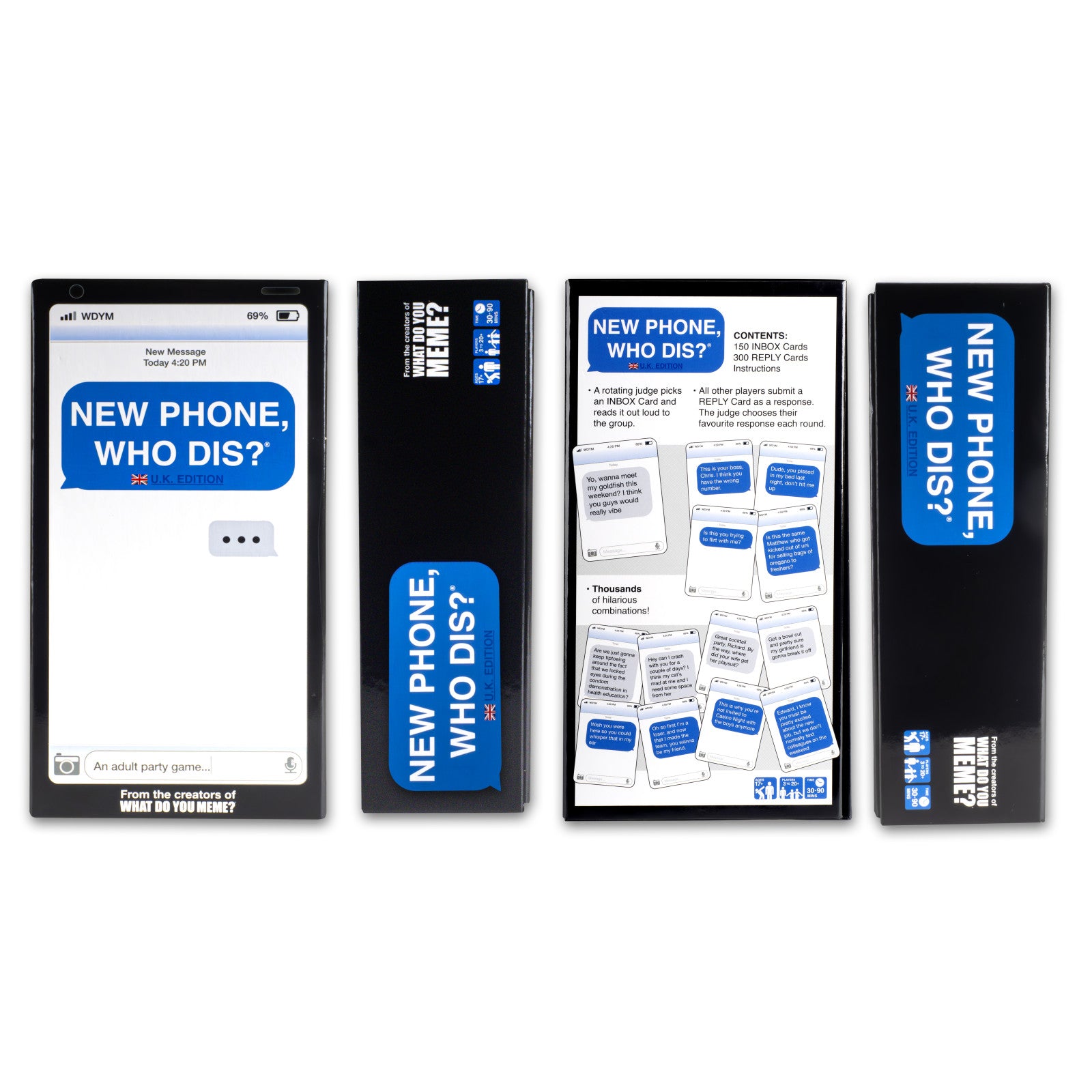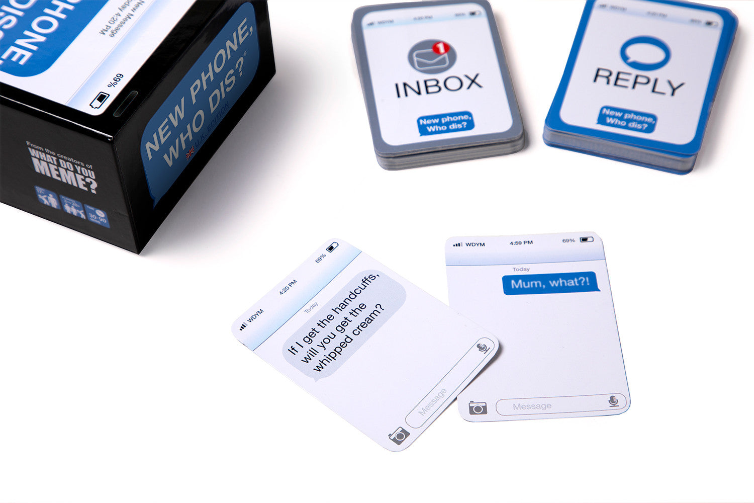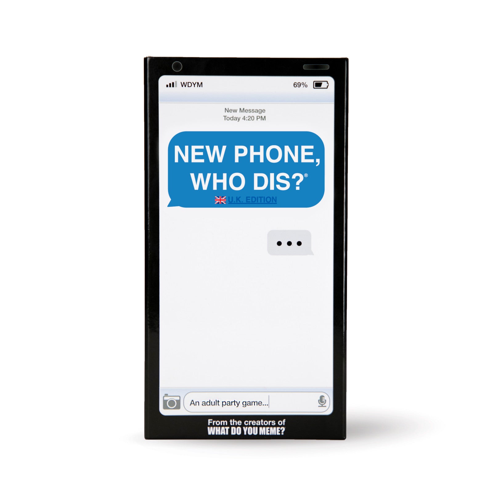 New Phone, Who Dis? (UK Edition) is the 100% offline texting party game where players compete to build the funniest (and most unhinged) text message thread. One player draws an Inbox text, everyone else slaps down their best Reply, and the “judge” picks the winner. It’s quick to learn, brutally funny, and perfect for big groups.